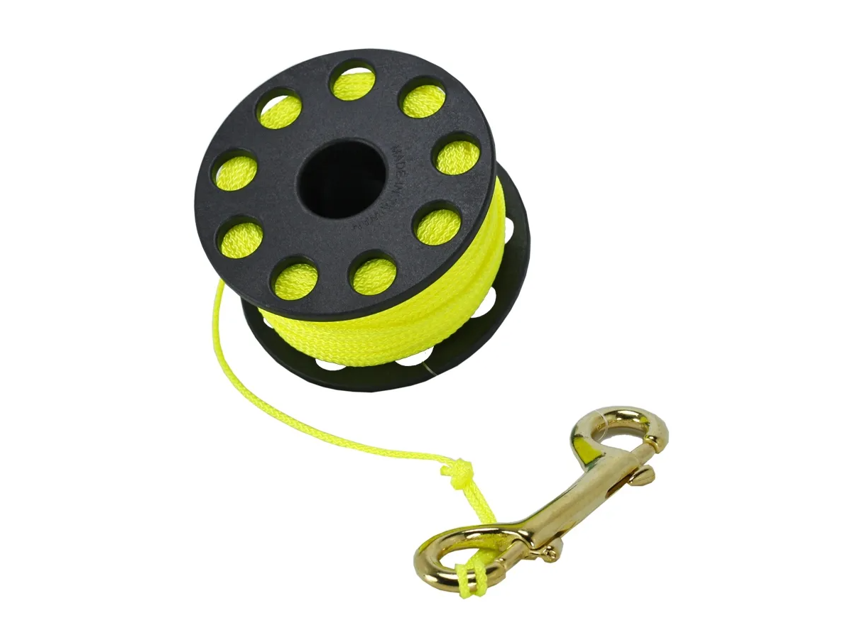 Катушка с 50-метровым желтым линем толщиной 3 мм, оснащенная двухсторонним латунным карабином.
